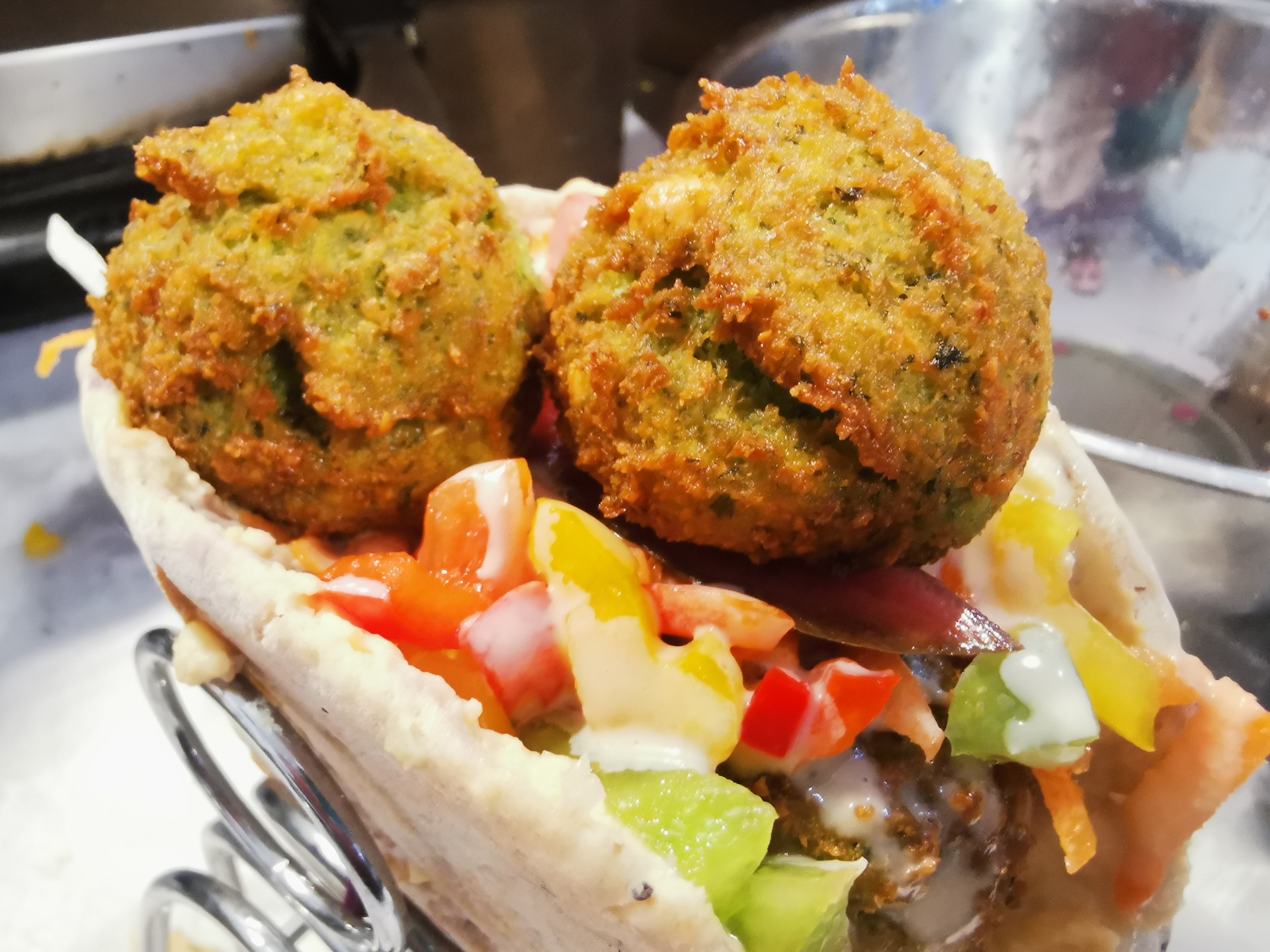 Hummus, Spinach, Marinated Red Cabbage, Julienne Carrot, Jalapenos, Diced Peppers, Tahini, Fresh Chilli Sauce