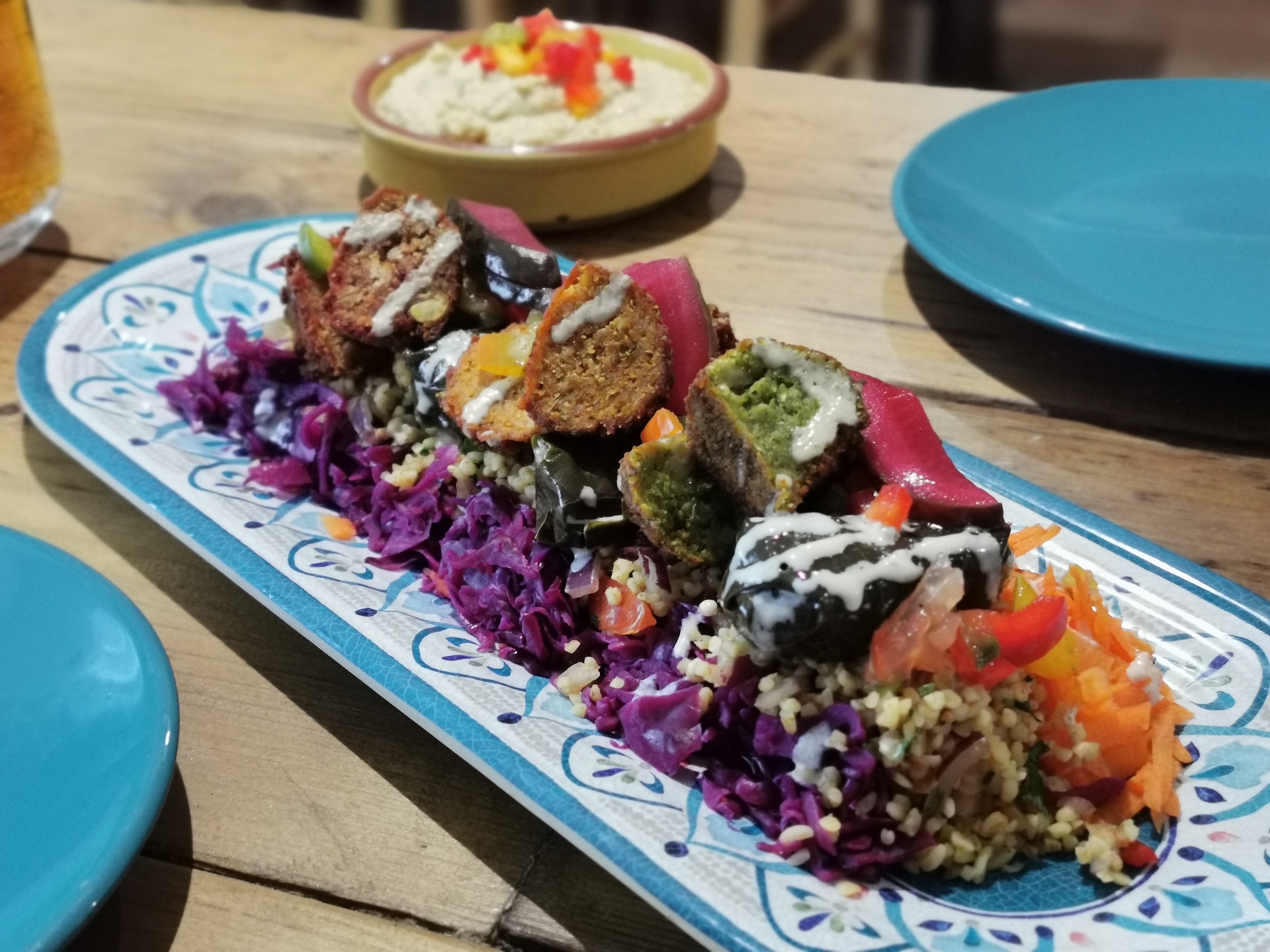 Hummus, Quinoa Tabbouleh, Marinated Olives, Stuffed Vine Leaves, Marinated Red Cabbage, Julienne Carrot, Pickles, Diced Peppers, Tahini, Basil Oil