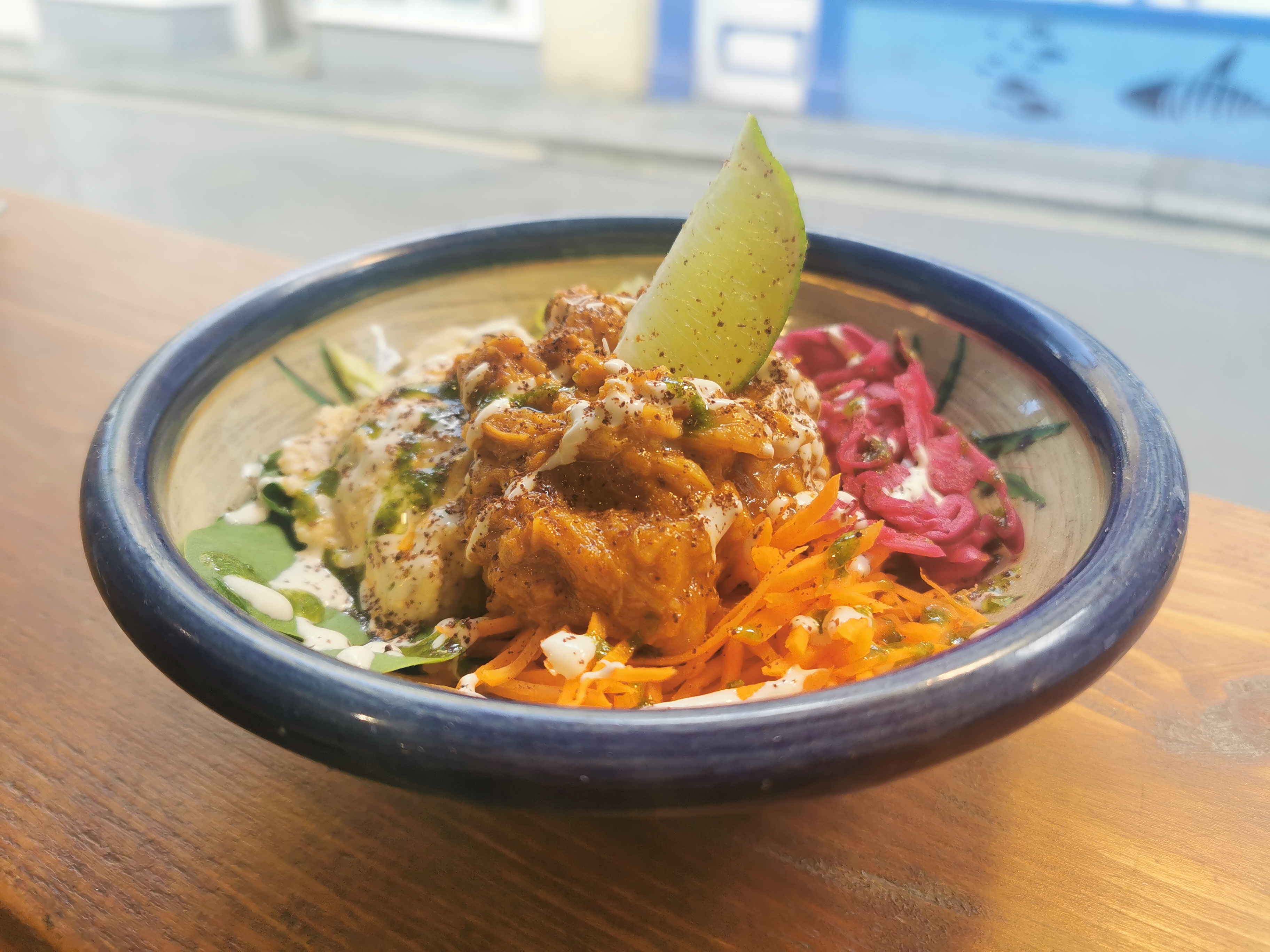 Sourdough Pitta, Hummus, Spinach, Lettuce, Marinated Red Cabbage, Julienne Carrot, Pickles, Diced Peppers, Tahini, Basil Oil